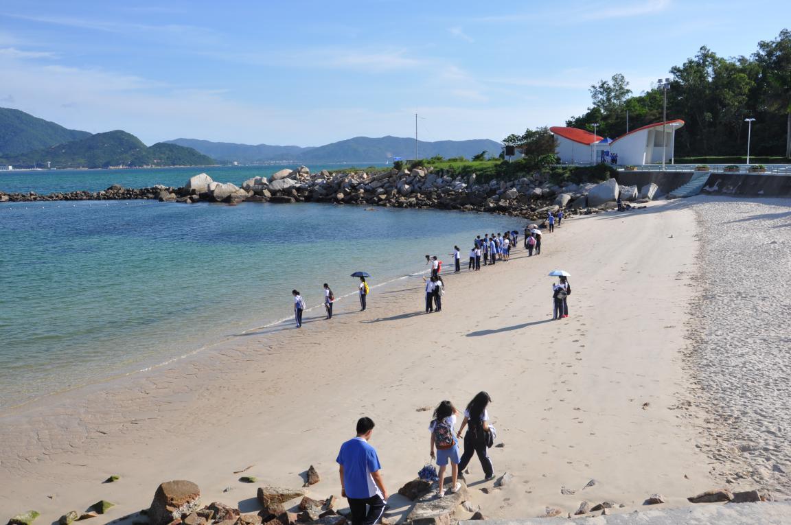 随后核电站工作人员组织大家进入核电基地观景台,大家看到了核电站的防浪措施——碎浪石,观看和实物一样大小的核岛安全壳钢筋混凝土的模型。站在观景台上,清新的海风迎面而来,整个大亚湾核电站尽收眼底。观景台的海滨砂质细腻,水质清澈,蓝绿色的海水更是独树一帜!