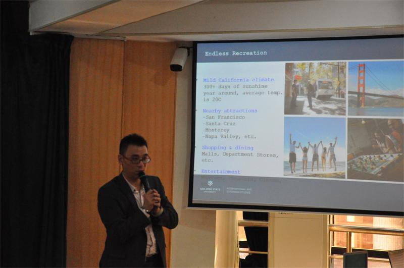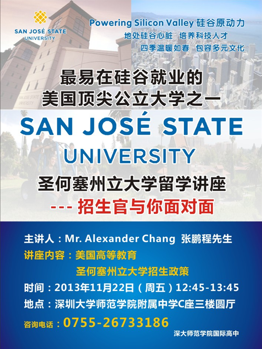 On 22nd of November, 2013, the admissions officer from San Jose State University, Mr. Alexander Chang gave a lecture at the Affiliated International School of Shenzhen University. Mr. Chang shared about the education system in US, and introduced the advantages of studying at San Jose, including its unique location, Silicon Village, the graduates’ high employment rate, its strength in applying science and so on. The students were active in asking questions to know more about the university.
